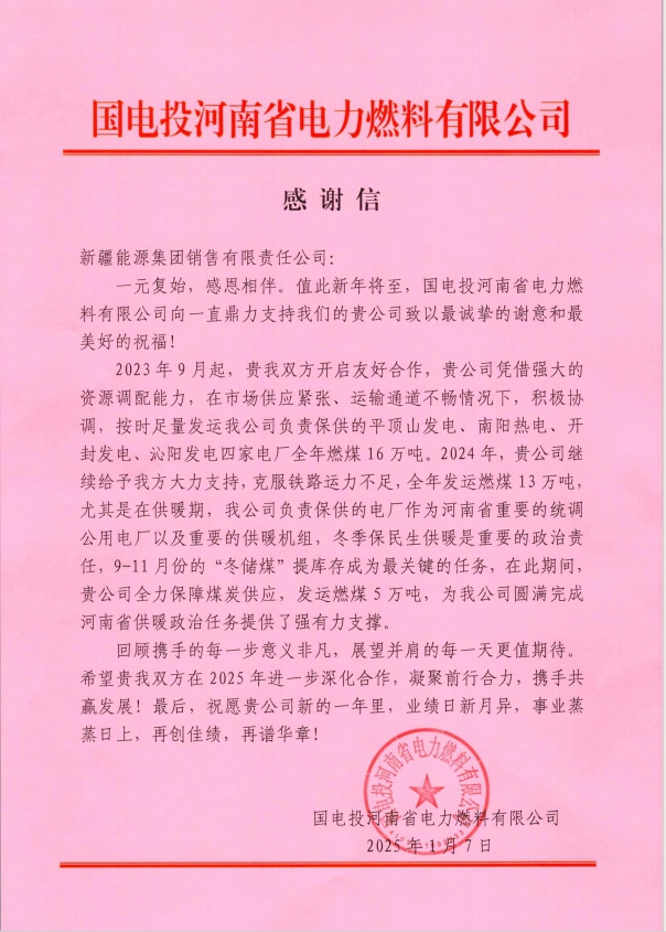近期,銷售公司(智營能源服務(wù)公司)收到一封來自長期合作伙伴——國電投河南省電力燃料有限公司的感謝信。這封信不僅表達(dá)了對公司過去一年里穩(wěn)定供應(yīng)和優(yōu)質(zhì)服務(wù)的誠摯感謝,更彰顯了雙方之間深...